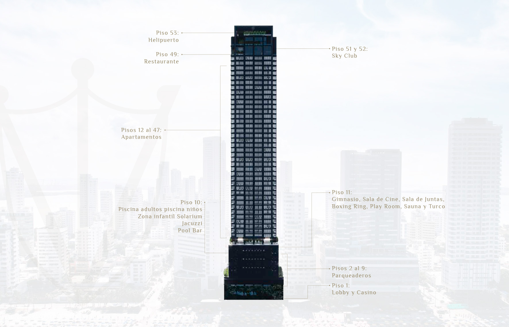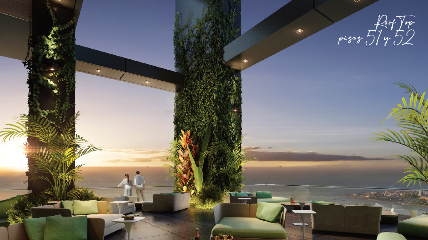 Desde lo alto del piso 53, un helipuerto a una altura de 182 m se alza majestuosamente sobre la península de Bocagrande, dotando a este lugar de una belleza indescriptible.