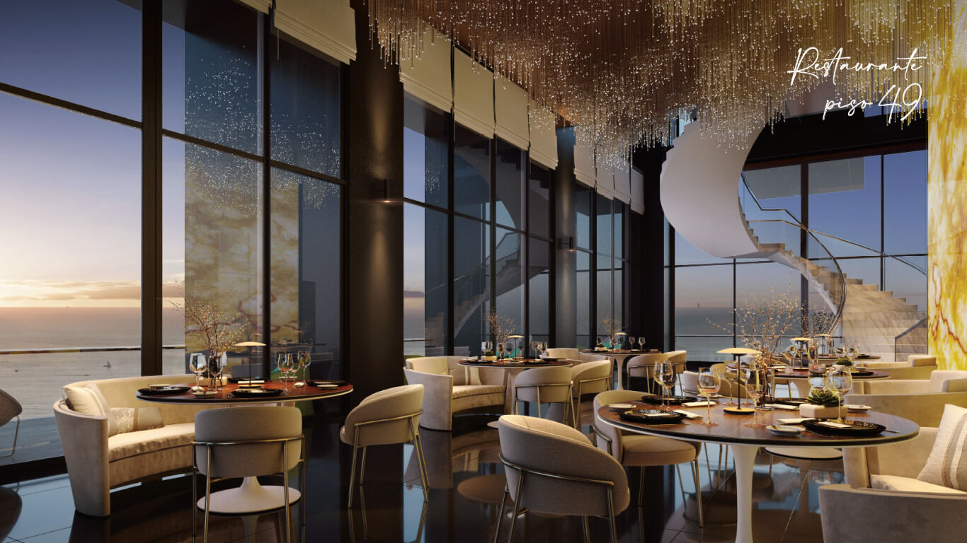 Comer junto a las estrellas es un placer que solo puede tener en el piso 49 de Invictvs. Un ambiente glamuroso, rodeado de grandes ventanales de vidrio que dejan apreciar una vista infinita simulando a hermosos cuadros que cuelgan en un museo de grandes obras de arte.