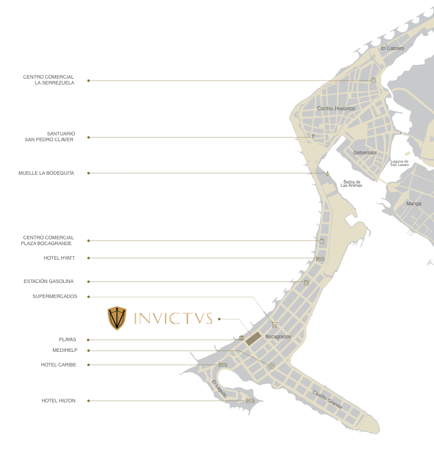 INVICTVS emerge en el corazón de Bocagrande, una hermosa península rodeada de agua, que pone a su alcance lo mejor de una ciudad con siglos de historia; que hoy es reconocida como uno de los destinos más deseados del mundo. Una zona con una especial energía, donde, a cualquier hora del día o de la noche, algo fascinante está pasando.